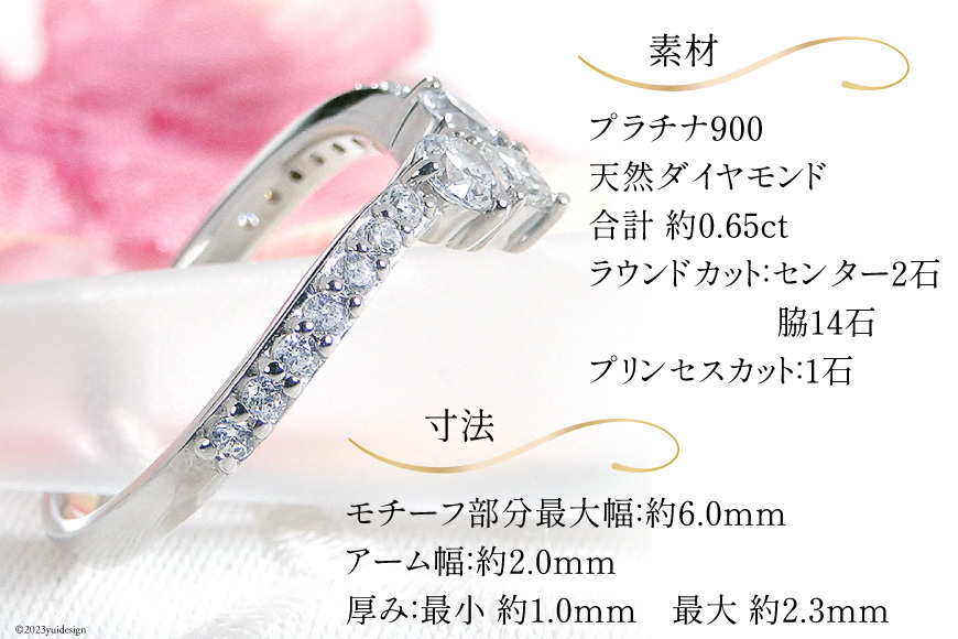| 容量 | ■内容量 ・PT900 ハートモチーフリング 1点 ・リングケース ・自社保証書 ・取り扱いご案内書 ■素材 ・プラチナ900 ・天然ダイヤモンド合計 約0.65ct ・ラウンドカット:センター2石/脇14石 ・プリンセスカット:1石 ※ダイヤの品質(セレクト時の目安):VSクラス ■寸法 モチーフ部分最大幅:約6.0mm アーム幅:約2.0mm 厚み:最小 約1.0mm 最大 約2.3mm |