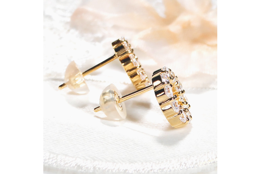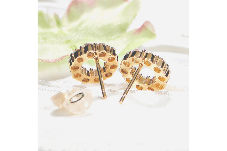 華やかなK18イエローゴールドの円形ベースに、両耳合計20石・約0.8ctの高品質ダイヤモンドをセットしたゴージャスなスタッドピアス。