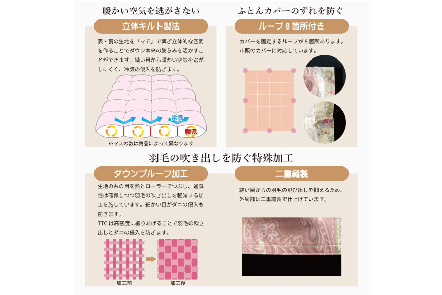 ※羽毛布団の特性上、縫い目や側生地からごく微量の羽毛が出てくることがありますが使用上問題はありません。