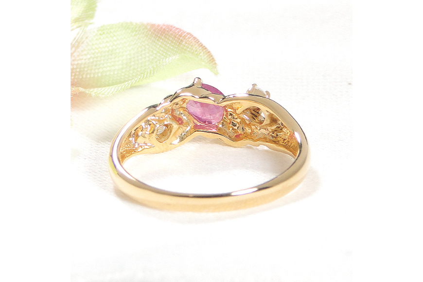 18イエローゴールドの結び目モチーフのセンターに真っ赤な大粒ルビー、両脇に2石の上質なダイヤモンドをセットし、華やかな雰囲気を纏うリングに仕上げました。