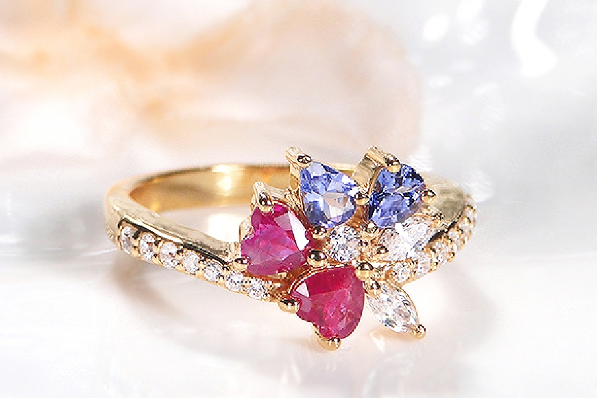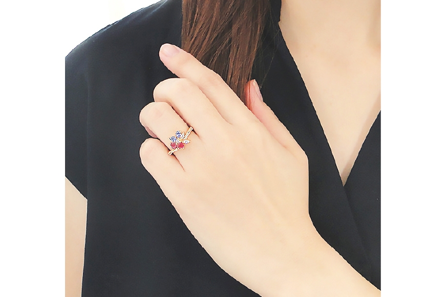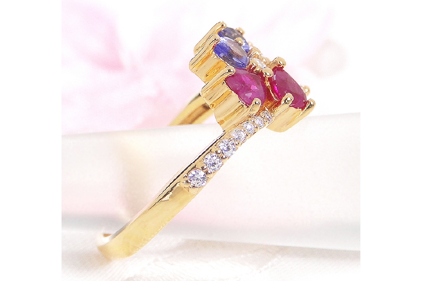 艶やかなK18イエローゴールドに、3種類のジュエル(ルビー・タンザナイト・ダイヤモンド)がきらめくお洒落な花束モチーフリング。