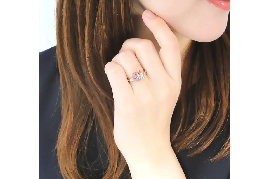艶やかなK18イエローゴールドに、3種類のジュエル(ピンクサファイア・ピンクスピネル・ダイヤモンド)がきらめくお洒落な花束モチーフリング。