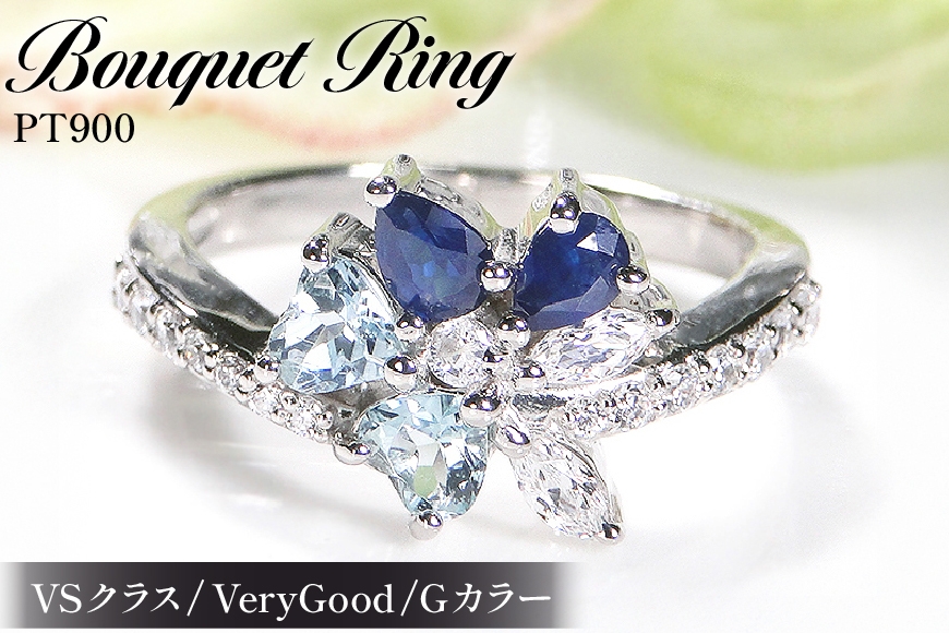 艶やかなプラチナ900に、3種類のジュエル(アクアマリン・ブルーサファイア・ダイヤモンド)がきらめくお洒落な花束モチーフリング。