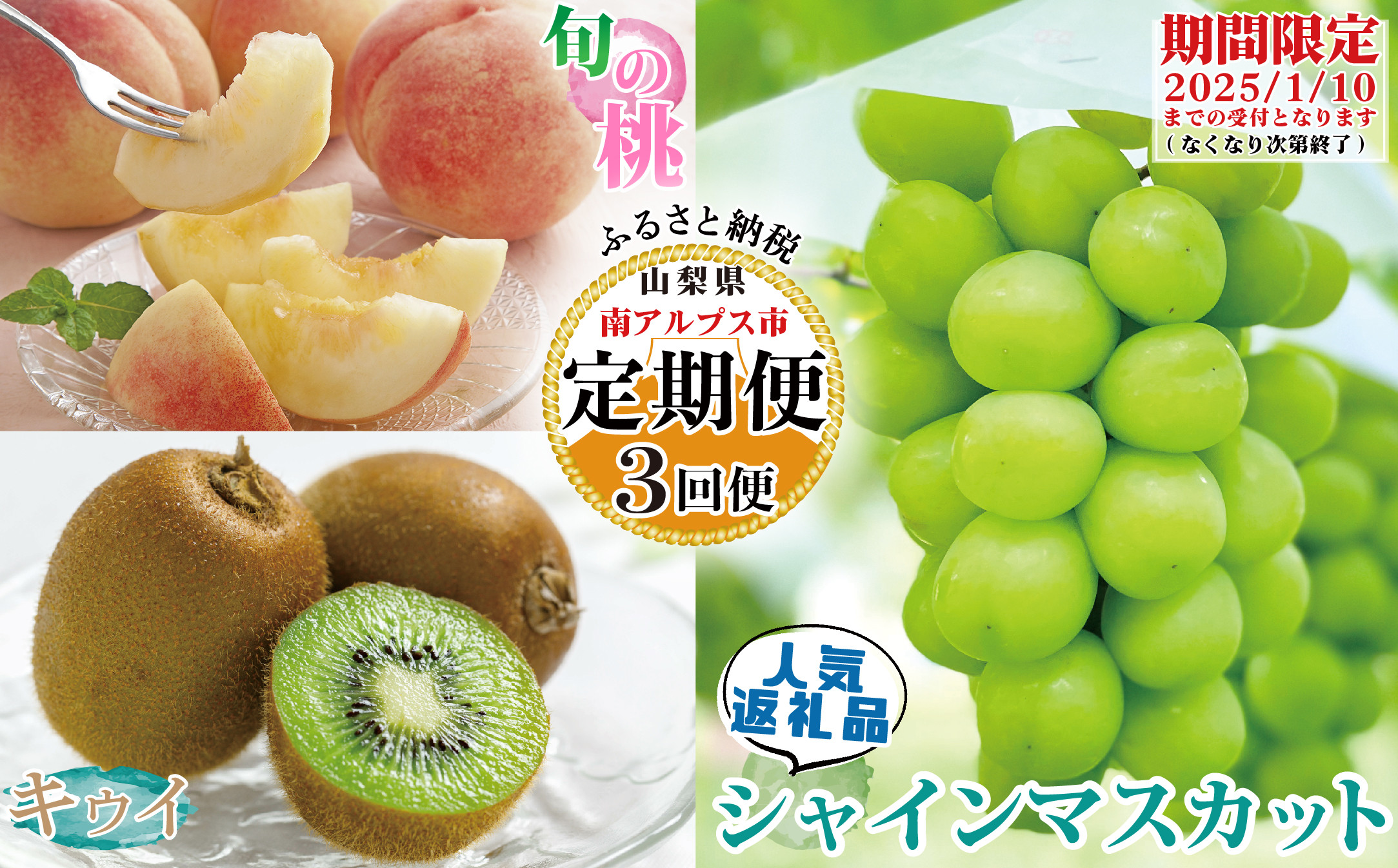 1月頃発送予定:キウイ(ヘイワード)約3㎏ 6月下旬~8月中旬頃発送予定:旬の桃 約2㎏(5~8玉) 8月下旬~10月中旬頃発送予定:シャインマスカット 2房(約1㎏) ■注意事項/その他【必ずお読みください】 ※画像はイメージです。 ※北海道、沖縄県、離島へのお届けはお受けできかねます。 ※日時指定は出来かねます。 ※天候や生育状況により発送時期が早まる又は遅れる可能性がございます。 ※発送過程において水分が蒸発し、容量が下がる場合がございます。 ※一部粒の傷みや変色、脱粒、軸色の変色等ある場合がございますが品質に問題ございません。 ※ぶどうはごく稀に種入りが混在している場合があります。 ※不備があった際は、発送日から3日以内のご連絡をお願い致します。対応については「不具合箇所」と「外装箱」のお写真が必須です。 ※生ものにつき直ぐにお受取り下さい。お客様の都合による再送、返品は出来かねますので、ご理解の上お申し込みください。 【返礼品に関するお問合せ先】ふるさと納税お問い合わせ事務局(Scale-UP株式会社) 宛 support-city.minami-alps@scale-up.co.jp |