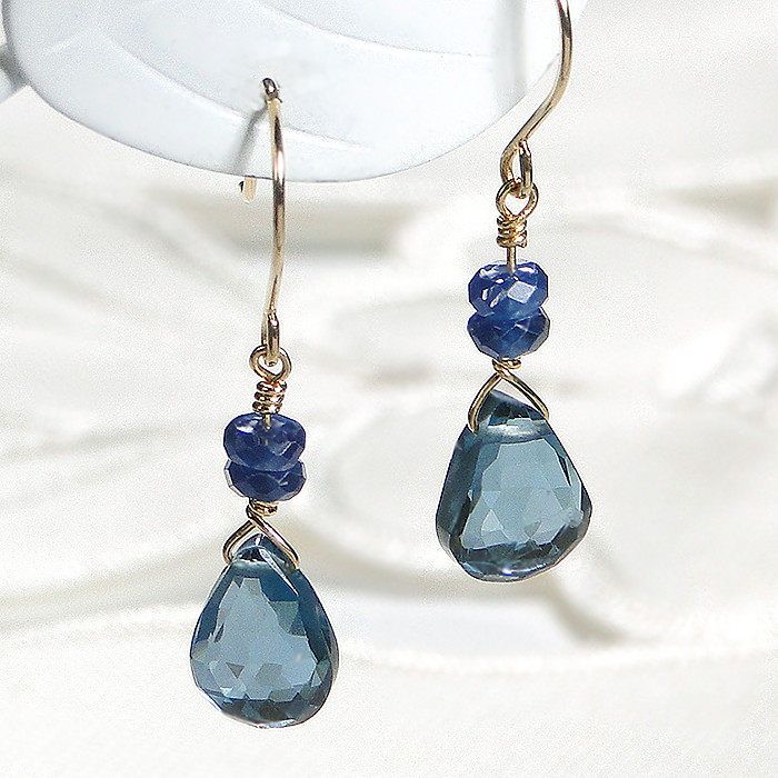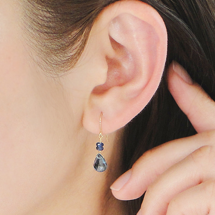 光を受けてキラキラと輝く、ドロップ型のサンタマリアアクアマリンに、人気の宝石ブルーサファイヤをあしらえて、チャーミングなピアスに仕上げました。