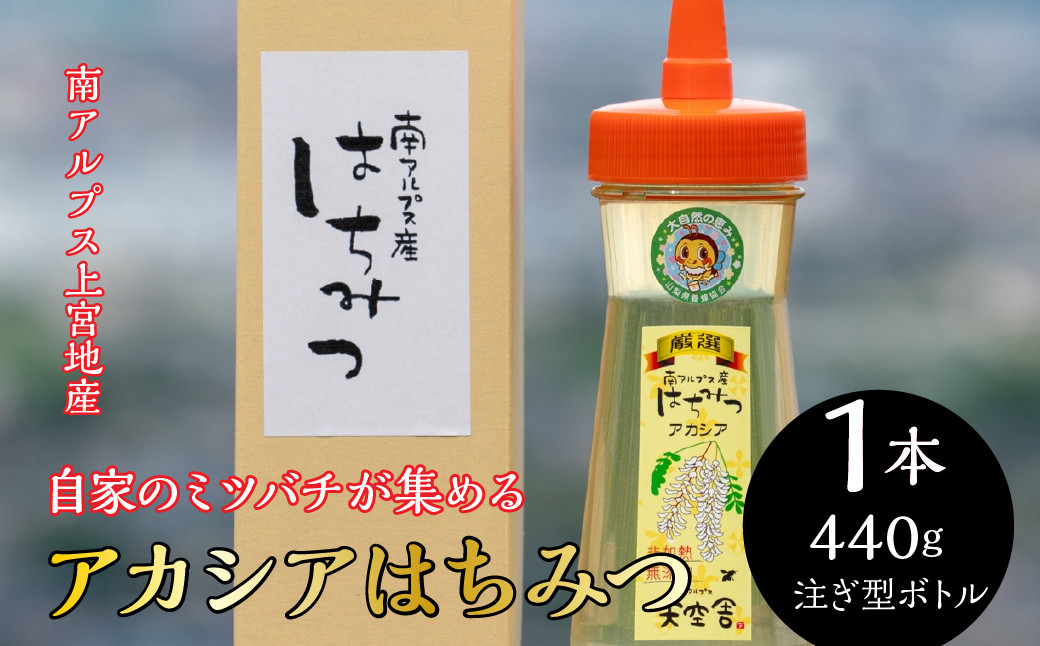 自家のミツバチが集める南アルプス上宮地さん 黄金色のアカシアはちみつ 注ぎ方ボトル 440g 1本 ALPAB023