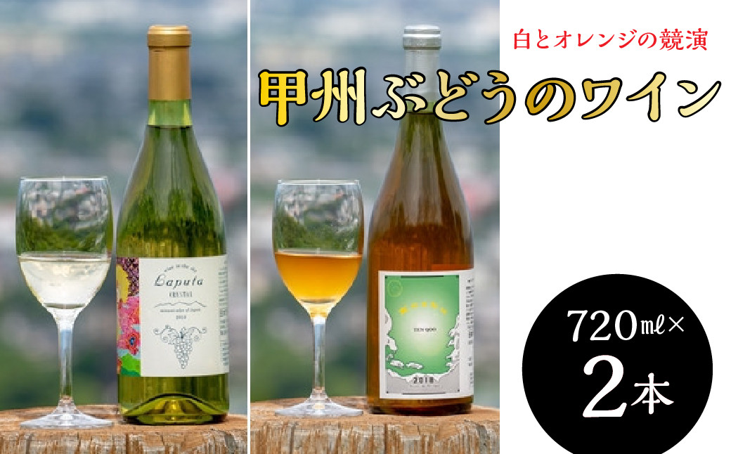 | 容量 | ①飯野産甲州ぶどう白ワイン「LaputaCRYSTAL」720ml1本 ②上宮地産甲州オレンジワイン「TenQoo甲州」720ml1本 【提供】南アルプス天空舎 |