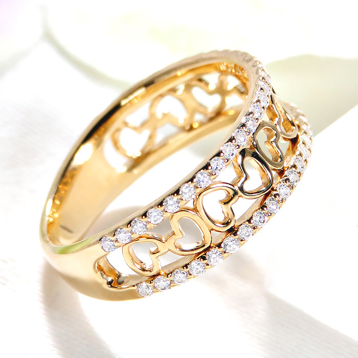 K18イエローゴールドのアームに施された、エアリーなハートの透かし模様。ハートモチーフを挟むように上質なダイヤモンドを計0.36ctあしらい、大人可愛いリングに仕上げました。