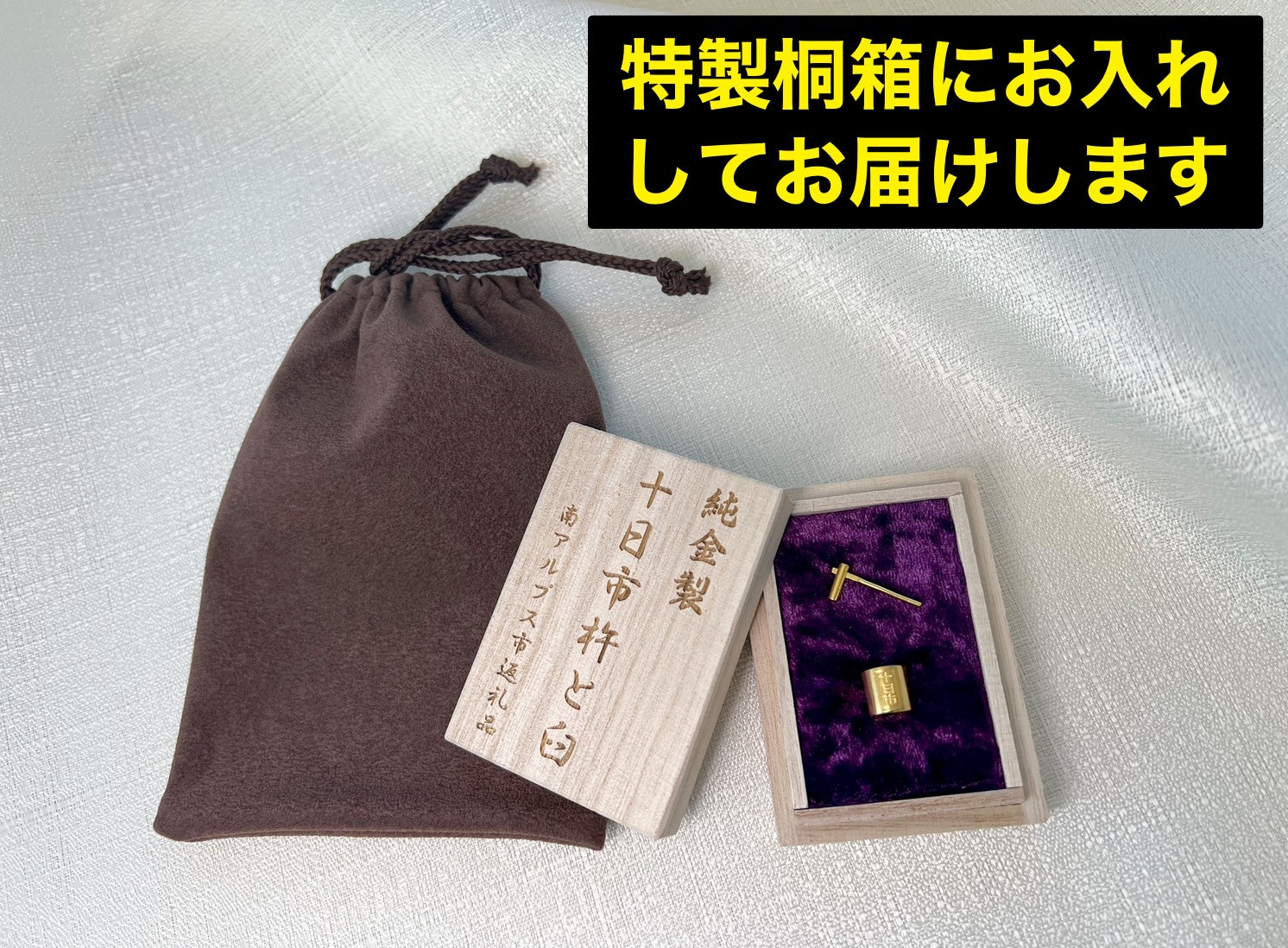 十日市は南アルプス市で毎年2月10、11日に開催される祭典です。 「十日市で売ってないものは、猫のたまごと馬の角ぐらいだ」という程、沢山の品物が売られています。 名物である木工品の杵と臼や縁起物の甲州だるまのほか植木や食べ物などなど、たくさんのお店が軒を連ねます。 その中でも代表的な「杵と臼」のミニチュアセットを黄金に輝く純金(24金)でお造りしました。 杵と臼は男女を意味しており、子孫繁栄を願う縁起物とも言われています。 ※ 市内工場にて鋳造・研磨・仕上げ・梱包まで全工程を行っています。