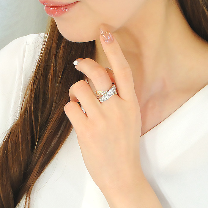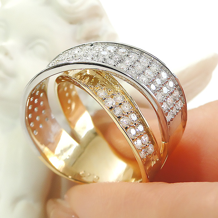 K18イエローゴールドとプラチナ900を交差させた幅広モチーフに、トータル0.9ctの上質なダイヤモンドをパヴェセッティング。