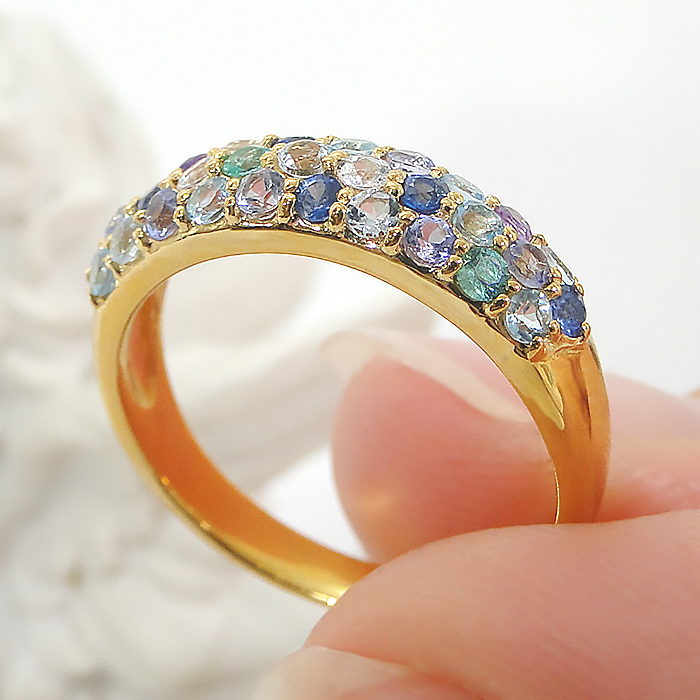 艶やかなK18イエローゴールドのベースに7種類のカラージュエル(ブルーサファイア・アクアマリン・アメジスト・ブルートパーズ・ホワイトサファイア・タンザナイト・エメラルド)を石畳のように敷きつめ、花畑のような色とりどりの輝きをぎゅっと詰めこんだ、カラフルなパヴェリングに仕上げました。