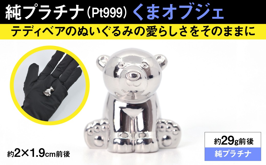 テディベアのぬいぐるみの愛らしさをそのままに、おすわり姿がチャーミングな「くま(ベア)」のオブジェを純プラチナ(Pt999 ※)でお造りしました。