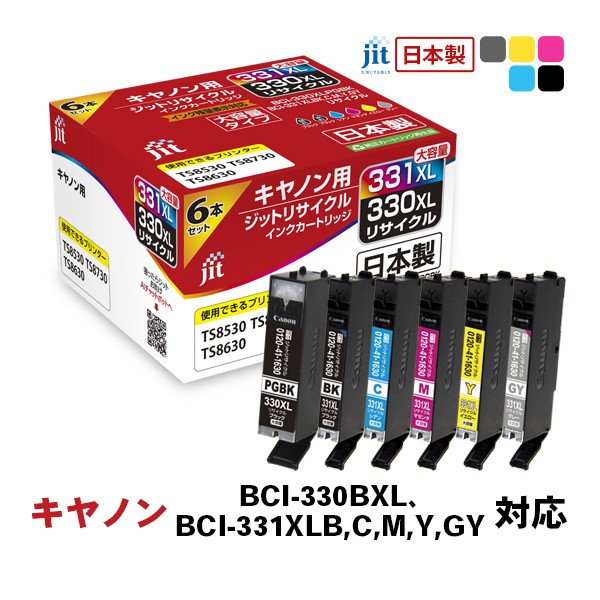 ジット 日本製インクカートリッジ BCI-330BXL、BCI-331XLB,C,M,Y,GY用リサイクルインクカートリッジ JIT-C3303316PXL (6色セット) ALPBN094