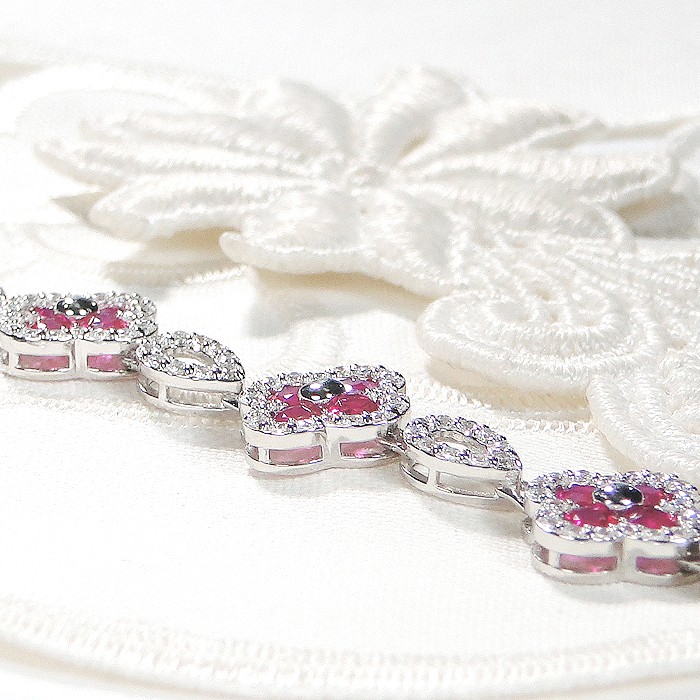 プラチナ900に、情熱的な赤色が印象的なルビー32石をあしらえた四つ葉デザインのブレスレット。