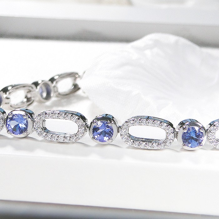 プラチナ900のラウンドと楕円のモチーフを交互に繋ぎ、大粒のタンザナイト10石と180石・トータル1.2ctの上質なダイヤモンドをあしらえた、気品漂うブレスレット。