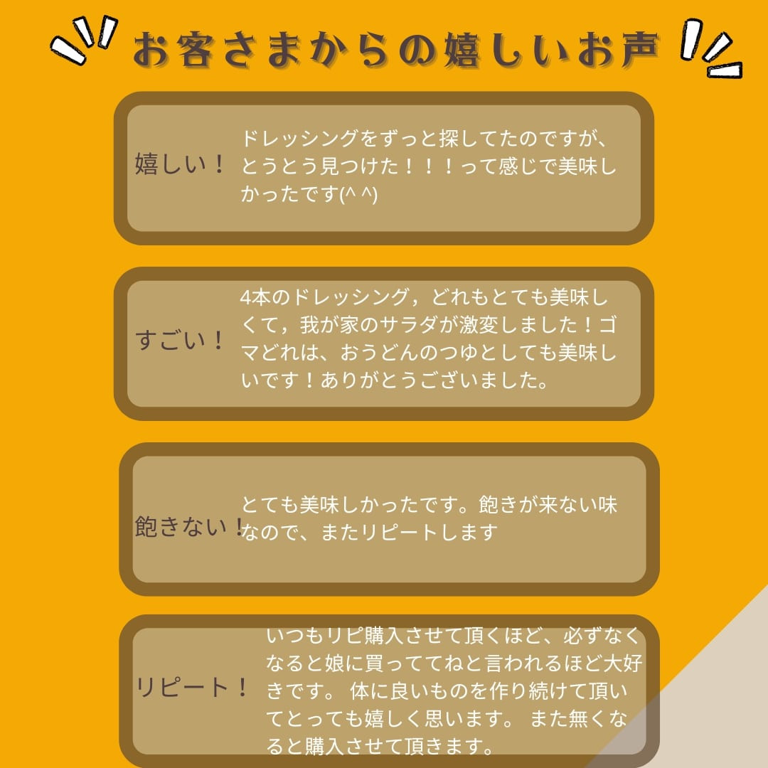 | 容量 | 【内容】 ・いちばん人気 人参ドレッシング 1本 ・華やかなパワーフード ビーツドレッシング 1本 ・何にかけても美味しい 胡麻ドレッシング 1本 ・スパイスが香る南国の味 オリエンタルドレッシング 1本 各200ml ×合計4本 【原材料】 ・人参(人参、玉葱、醤油、酢、国産菜種油、にんにく、きび砂糖) ・ビーツ(自社栽培ビーツ、玉ねぎ、醤油、酢、国産菜種油、にんにく、きび砂糖) ・胡麻(玉ねぎ、黒胡麻、醤油、酢、国産菜種油、にんにく、きび砂糖) ・オリエンタル(国産菜種油、セロリ、玉ねぎ、酢、ナンプラー、きび砂糖、にんにく、スイートチリソース、コリアンダー、クミン、胡麻、花椒) |