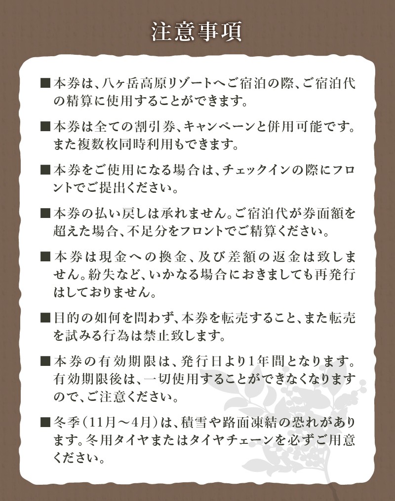 ■本券は、八ヶ岳高原リゾートへご宿泊の際、ご宿泊代の精算に使用することができます。