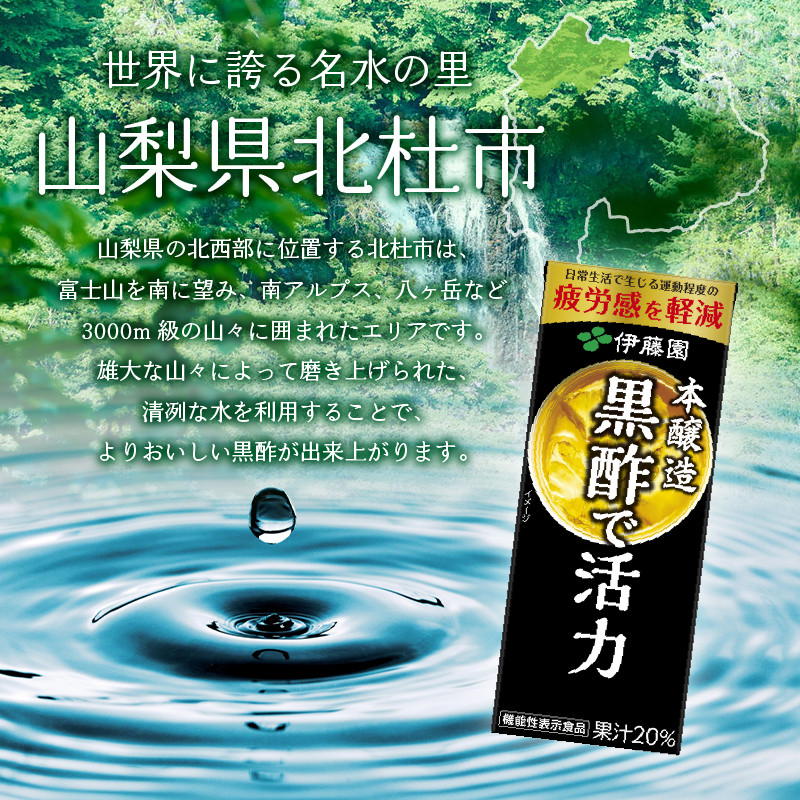 世界に誇る名水の里「北杜市名水」を利用した、伊藤園「黒酢で活力」紙パックです。