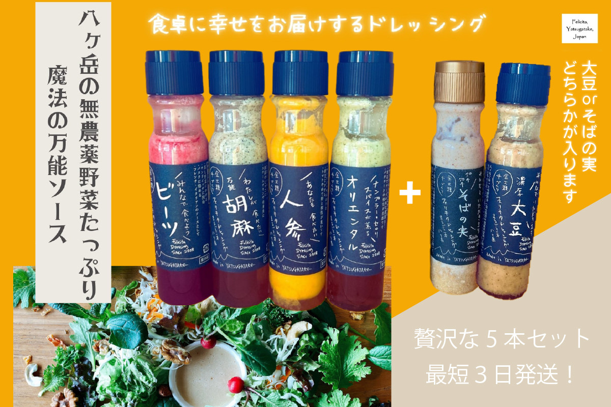 八ヶ岳の野菜を食べるフェリチタドレッシング フェリチタドレッシング5本セット ドレッシング 200m 5本 セット 有機 野菜 調味料 人参 ビーツ 胡麻 オリエンタル 大豆 そばの実 万能 フェリチタ