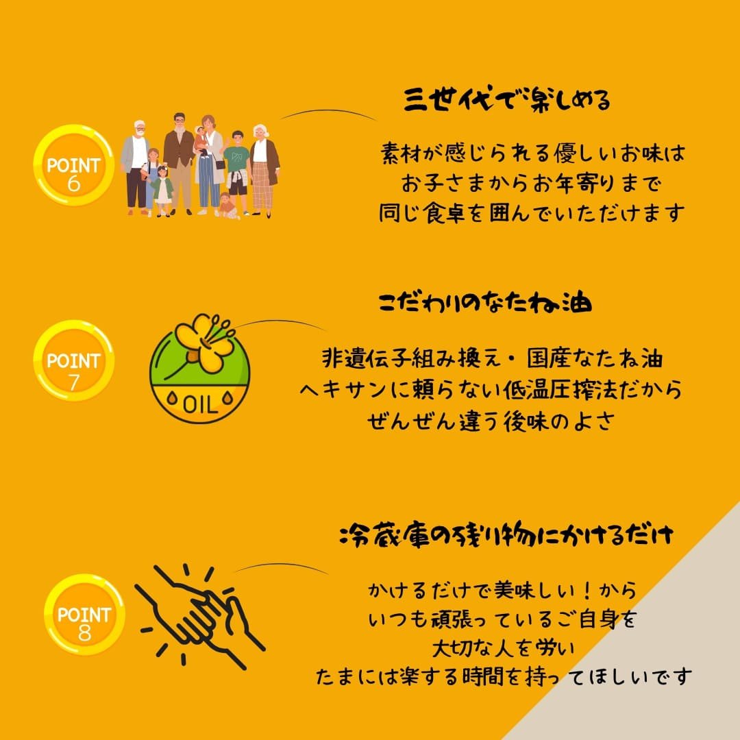 「万能調味料」として、サラダだけではなく、しゃぶしゃぶのタレ、白身魚のソース、パスタに絡めて、冷ややっこにのせて、温野菜でも生野菜でも、素材の旨味を邪魔する事なく、様々なお料理に使っていただけます。