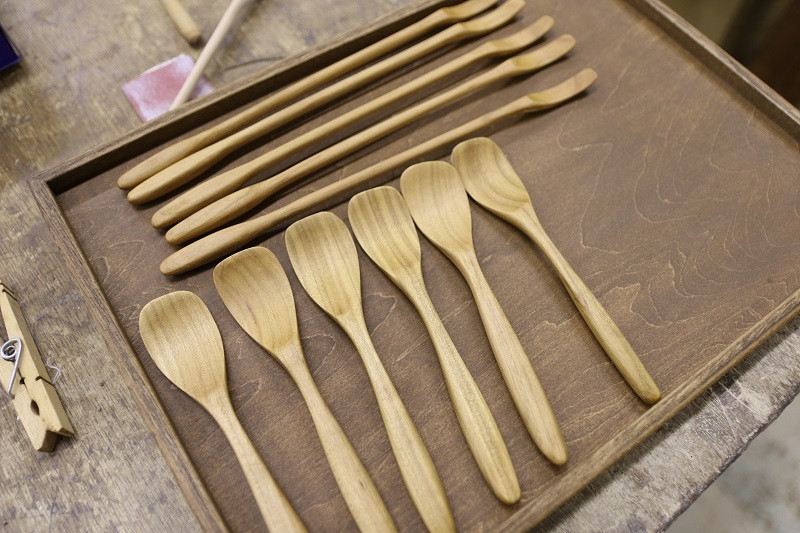 付属の匙の製作は、八ヶ岳の山から切り出した山桜を材に、木工作家『我楽舎』さんに依頼。
