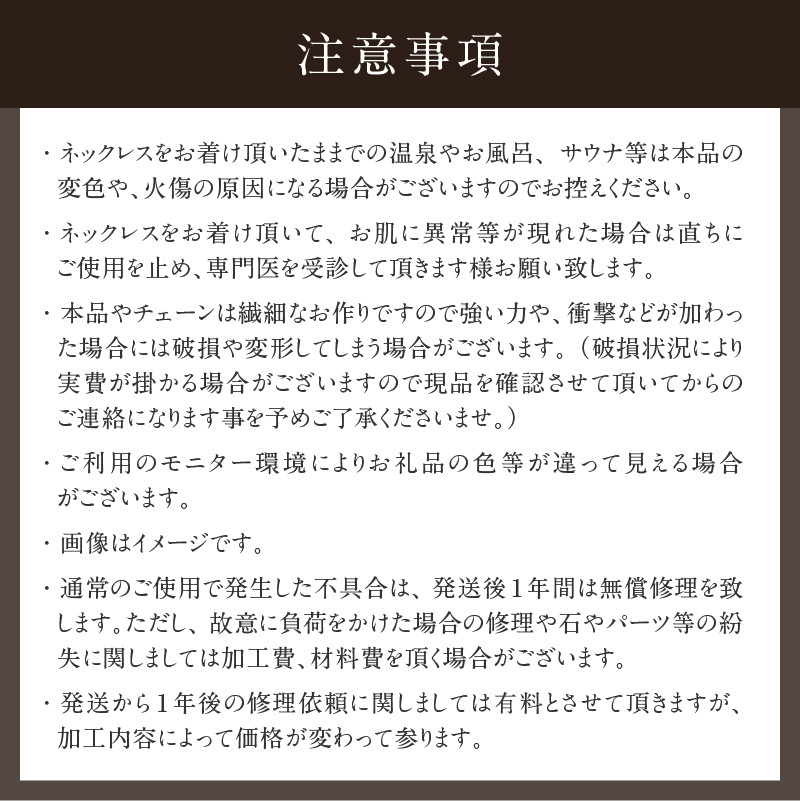 ・ネックレスをお着け頂いたままでの温泉やお風呂、サウナ等は本品の変色や、火傷の原因になる場合がございますのでお控えください。