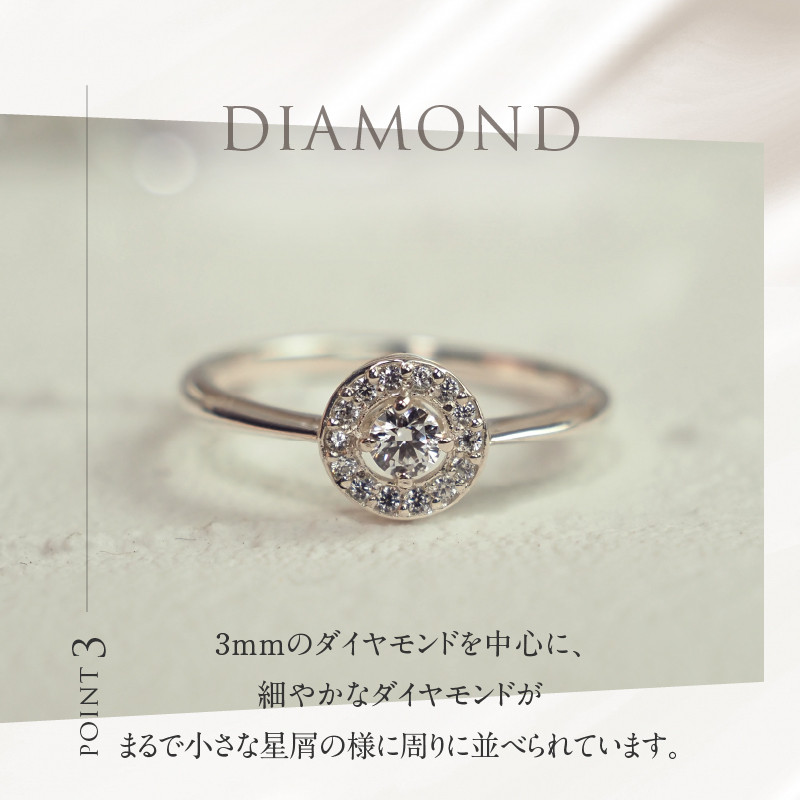 3mmのダイヤモンドを中心に、細やかなダイヤモンドがまるで小さな星屑の様に周りに並べられています。