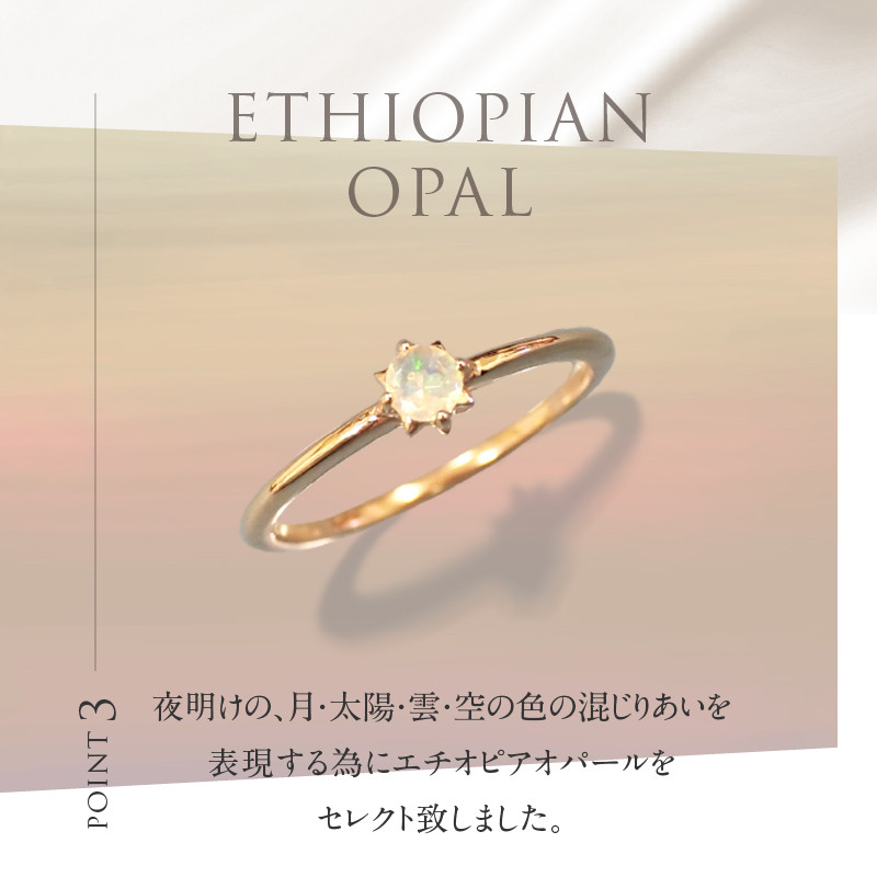 夜明けの、月、太陽、雲、空の色の混じりあいを表現する為にエチオピアオパールをセレクト致しました。