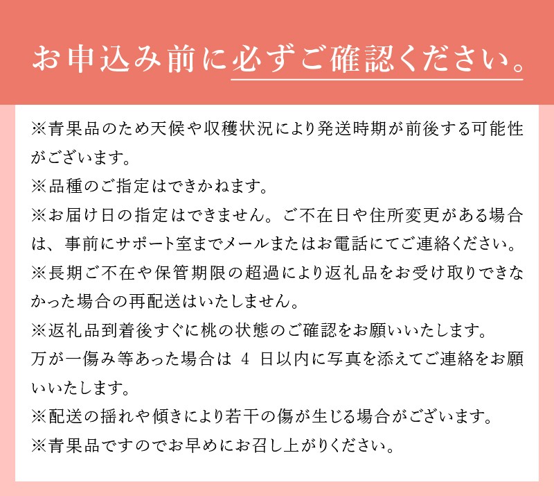 ※返礼品到着後すぐに桃の状態のご確認をお願いいたします。万が一傷み等あった場合は4日以内に写真を添えてご連絡をお願いいたします。