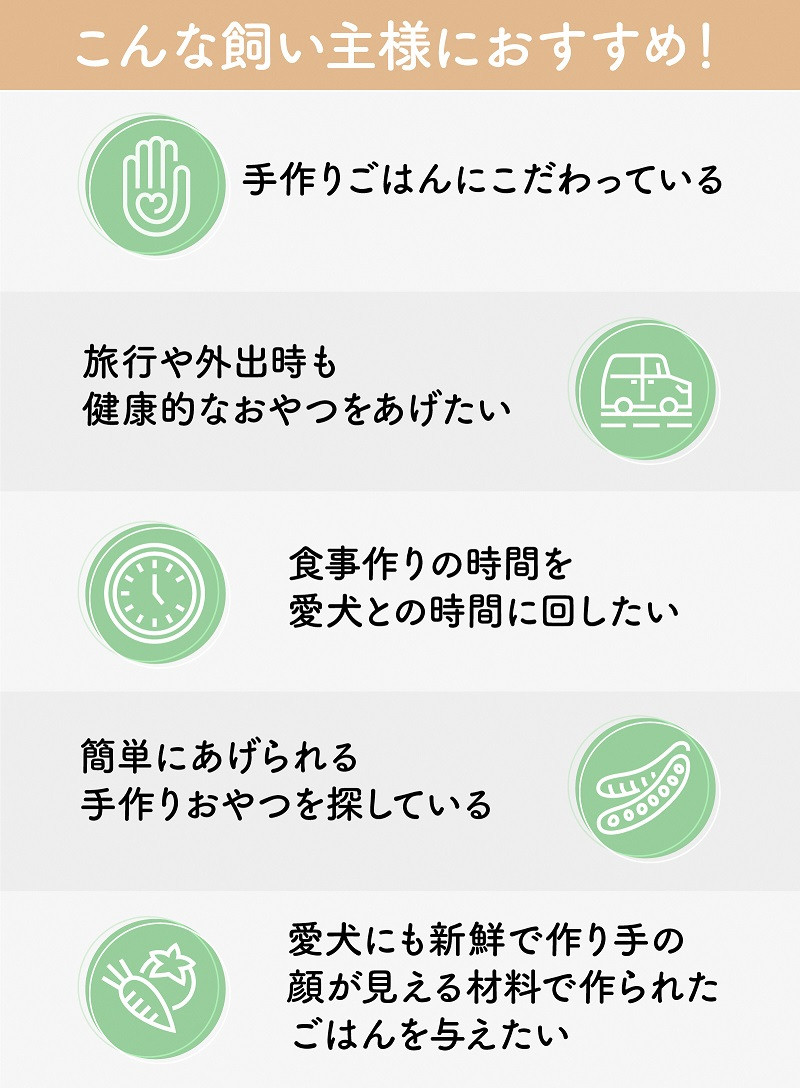 完全加熱済み、人間専用の菌検査での合格証も取得!安心安全に、旅行先などでお手軽に食材にこだわった手作り食をあげることができます。