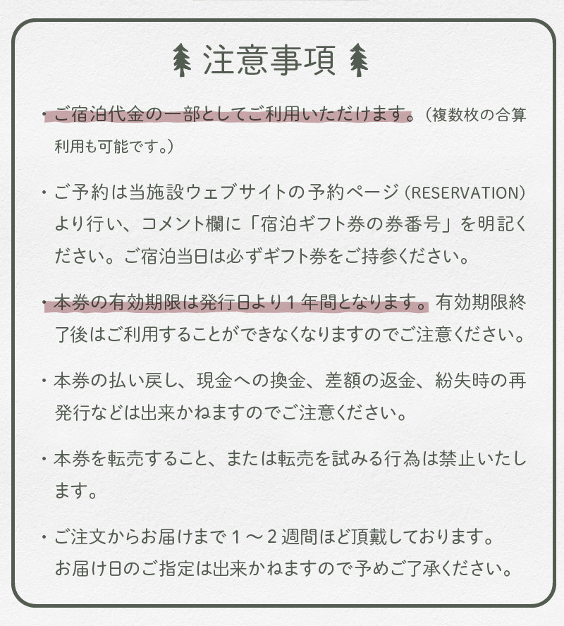 ・ご予約は当施設ウェブサイトの予約ページ(RESERVATION)より行い、コメント欄に「宿泊ギフト券の券番号」を明記ください。ご宿泊当日は必ずギフト券をご持参ください。