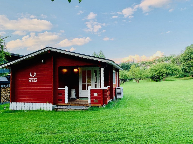 甲斐駒ヶ岳を間近に見上げ、周囲を4,000坪の芝生エリアに囲まれた絶景ログハウスサロンMYSA(ミーサ)。