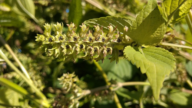 収穫後乾燥させたえごまの穂をたたいて、脱穀します。
