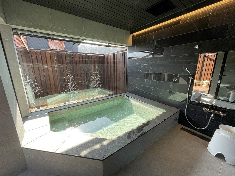 ガラス張りの大きなお風呂は、一度に10人で入浴できて、スチームサウナもあります。