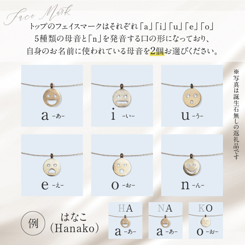 それぞれ「a」「i」「u」「e」「o」5種類の母音と「n」を発音する口の形になっており、自身のお名前に使われている母音をセレクトし、お好きな誕生石を留めカスタムすることができます。