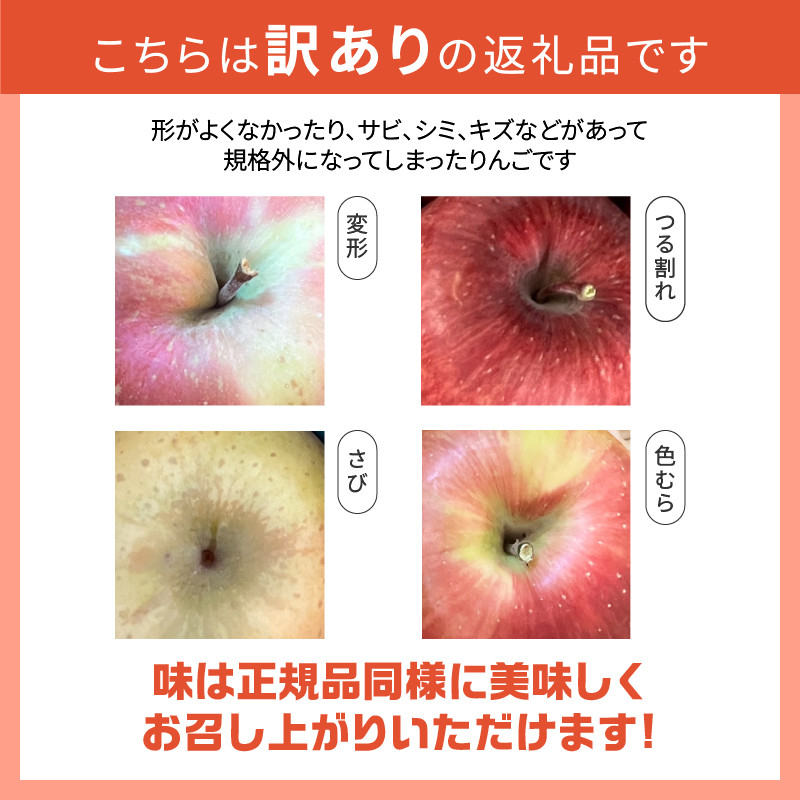 訳あり品は、形がよくなかったり、サビ、シミ、キズなどがあって規格外になってしまったりんごです。