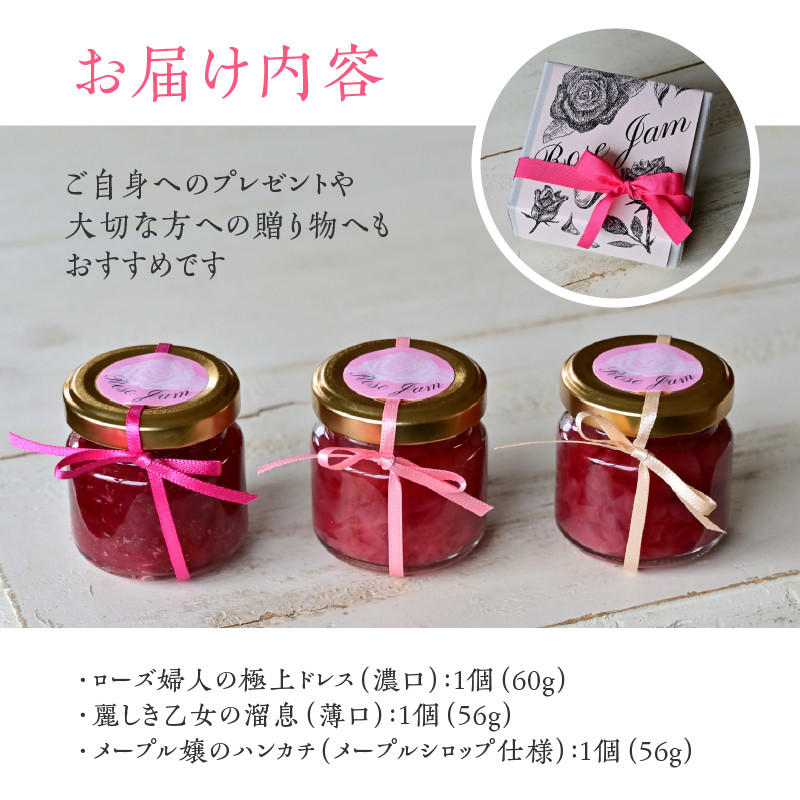 | 容量 | 【内容】 薔薇ジャム3種セット ・ローズ婦人の極上ドレス(濃口):1個(60g) ・麗しき乙女の溜息(薄口):1個(56g) ・メープル嬢のハンカチ(メープルシロップ仕様):1個(56g) 【原材料】 薔薇の花びら、甜菜糖、メープルシロップ、レモン |