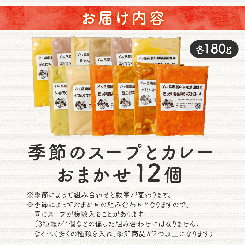 八ヶ岳南麓の自家菜園で育てた無農薬野菜 おまかせ季節のスープとカレー12個セット スープ カレー 組み合わせ おまかせ 12個 セット 各180g 無農薬 野菜 コーン カボチャ サツマイモ ジャガイモ ズッキーニ サトイモ キノコ パプリカ カブ タマネギ ナス トマト 味噌 食品添加物不使用 化学調味料不使用 詰め合わせ 北杜市