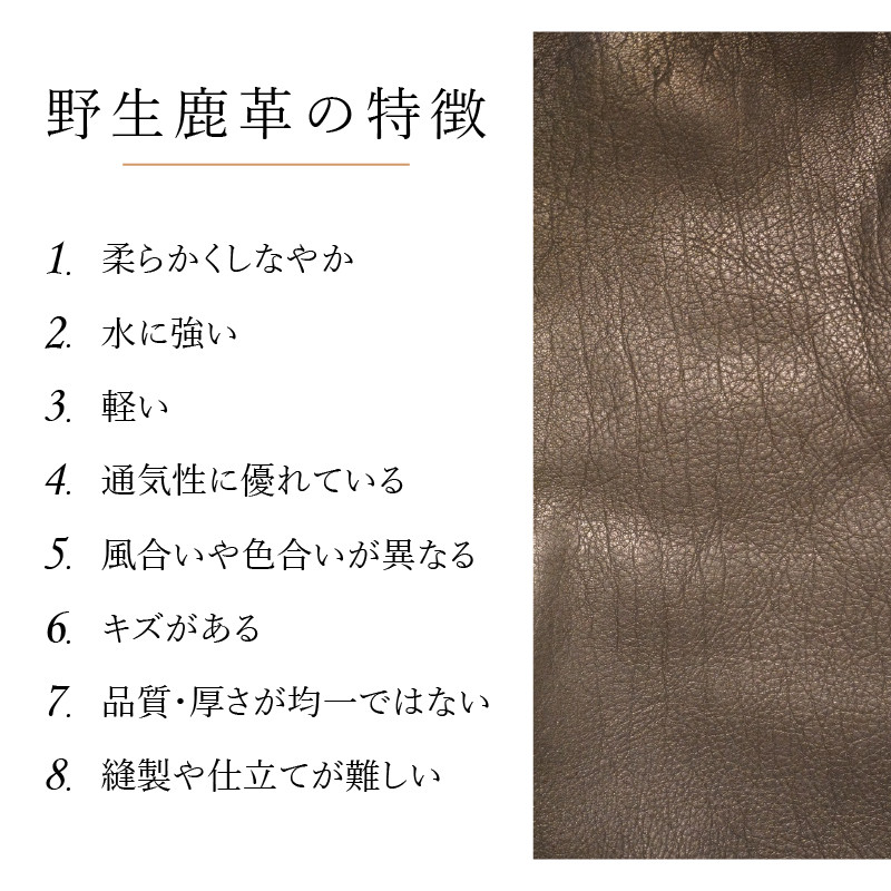 主素材となる鹿革は、南アルプス、八ヶ岳を有する山梨県北杜市の森林で獣害駆除された鹿革をアップサイクルしたアップサイクルレザー。