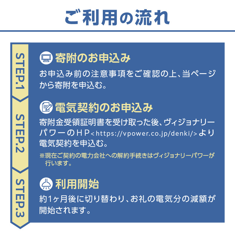 お礼品をお受け取りいただくには、ふるさと納税お申込み後、電力供給契約をヴィジョナリーパワーに切り替えていただく必要があります。