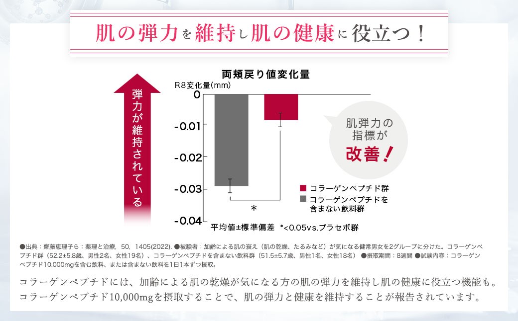 また、加齢による肌の乾燥が気になる方の肌の弾力を維持し肌の健康に役立ち、骨をつくるはたらきをサポートします。