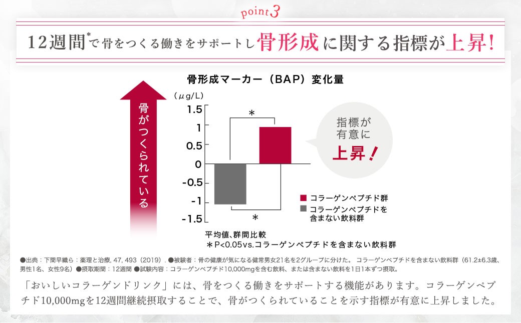 また、加齢による肌の乾燥が気になる方の肌の弾力を維持し肌の健康に役立ち、骨をつくるはたらきをサポートします。