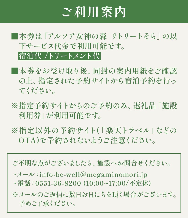 ※注意:指定予約サイトからのご予約のみ、返礼品「施設利用券」が利用可能です。