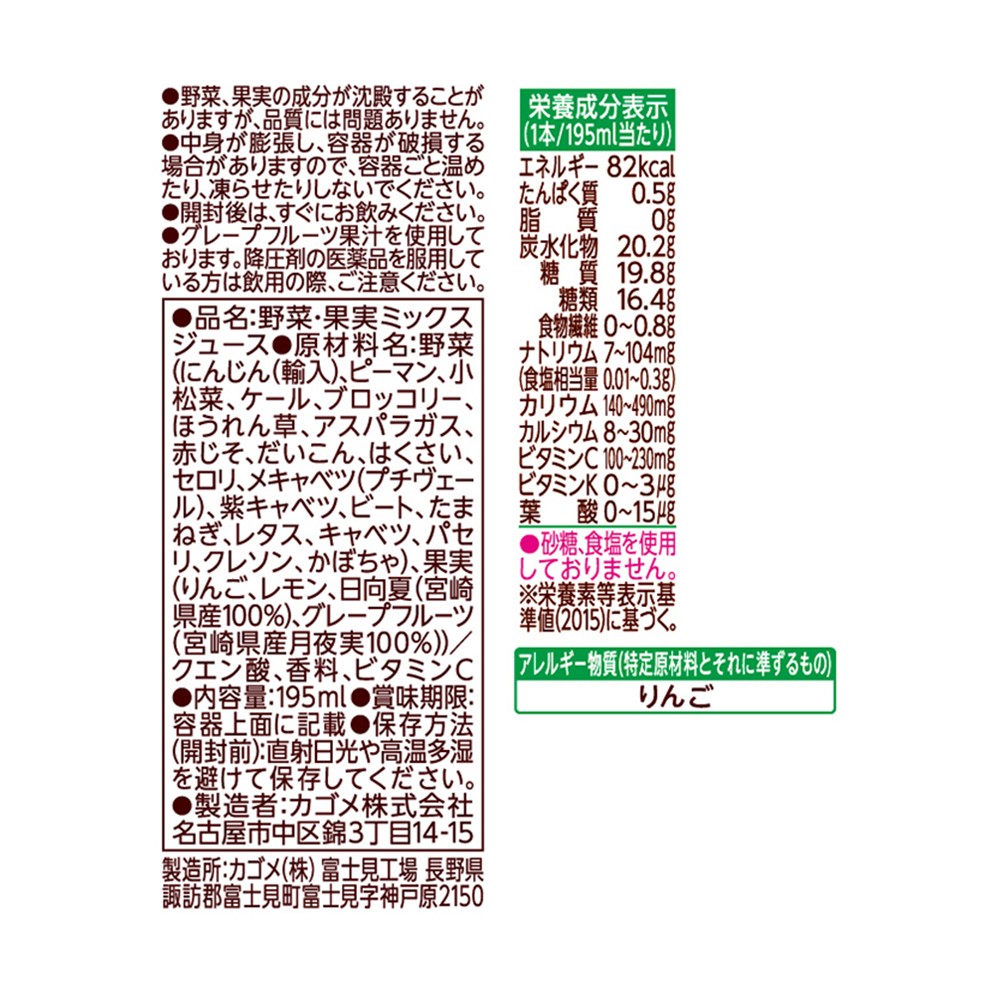 | 容量 | 【内容量】 カゴメ 野菜生活100 宮崎月夜実グレープフルーツ&日向夏ミックス 195ml×96本入り 【原材料】 野菜(にんじん(輸入)、ピーマン、小松菜、ケール、ブロッコリー、ほうれん草、アスパラガス、赤じそ、だいこん、はくさい、セロリ、メキャベツ(プチヴェール)、紫キャベツ、ビート、たまねぎ、レタス、キャベツ、パセリ、クレソン、かぼちゃ)、果実(りんご、レモン、日向夏(宮崎県産100%)、グレープフルーツ(宮崎県産月夜実100%))/クエン酸、香料、ビタミンC |