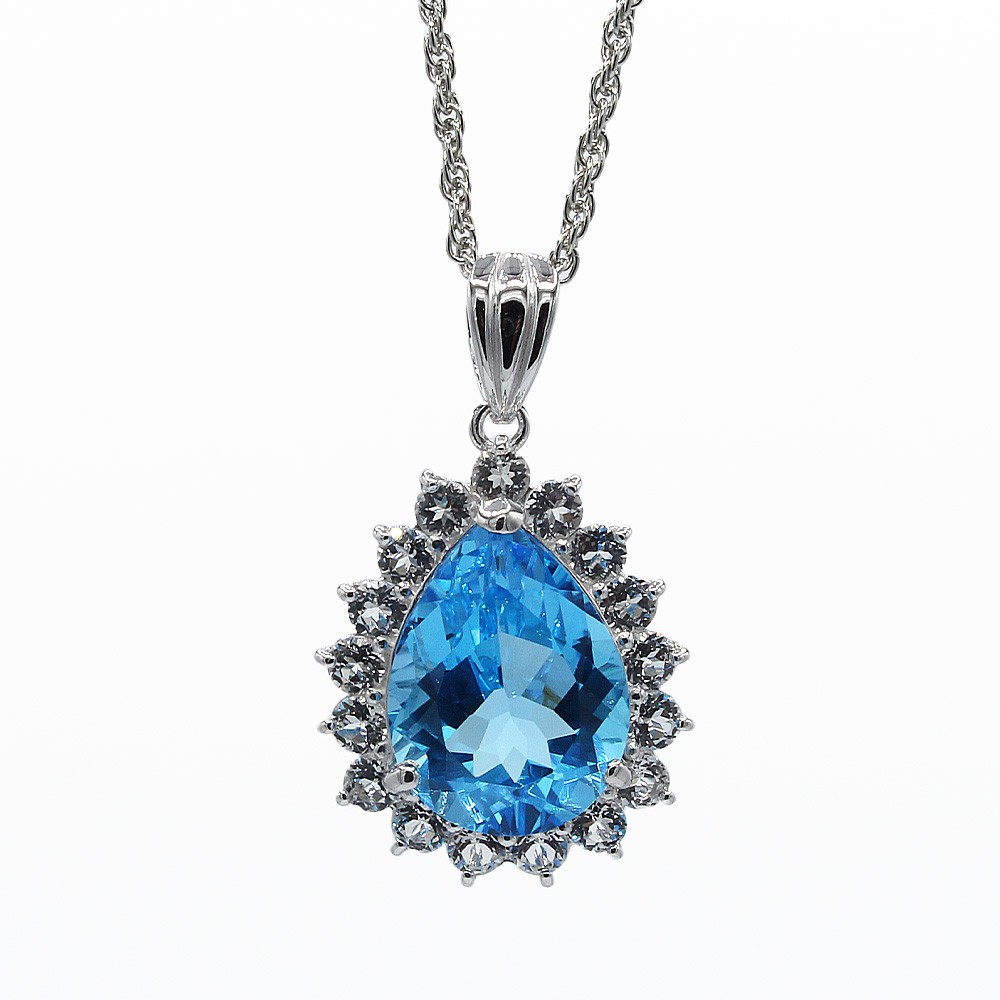 大粒10ctのペアシェイプカットのブルートパーズを17個、計2.0ctのホワイトトパーズで取り巻いた豪華で可愛らしいペンダントです。