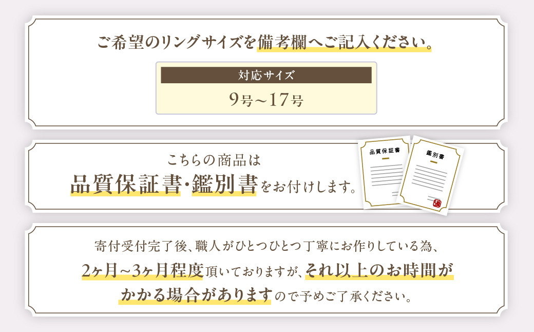 熟練した職人の手から手へと渡る間には、厳密にチェックする4度の検品が設けられています。これらはすべて、一点一点に贈る人の想いが込められる特別なジュエリーだからこそ、何十年という 時が経っても、その想いと輝きが失われないものになるよう丁寧に行われます。最終検品を経て完 成された商品は、お客様のご注文通りの商品に仕上がっていることは当然のことながら、JAPAN QUALITY の品質基準を満たしたジュエリーだけが届けられます。 世界的にジュエリーの価格高騰が進んでいる中で、グローバルコーポレーションはジャパン・メイ ドにこだわり、価格以上に人生を彩る価値ある商品を届けられるよう、これからも挑戦しつづけていきます。