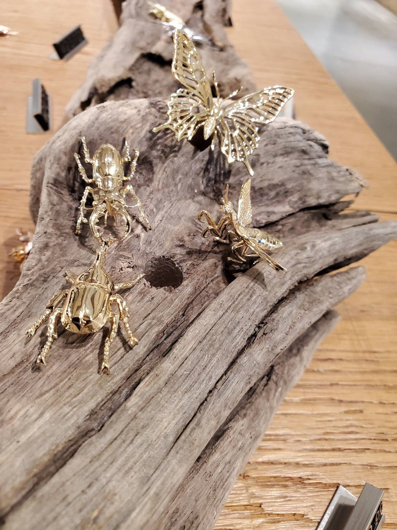 3D プリンターの造形でさえ表現しきれない昆虫の独創的な模 様から複雑な手足、触角に至るまでリアルに繊細かつ荒々しいデザインをジュエリーに昇華させた職人技。