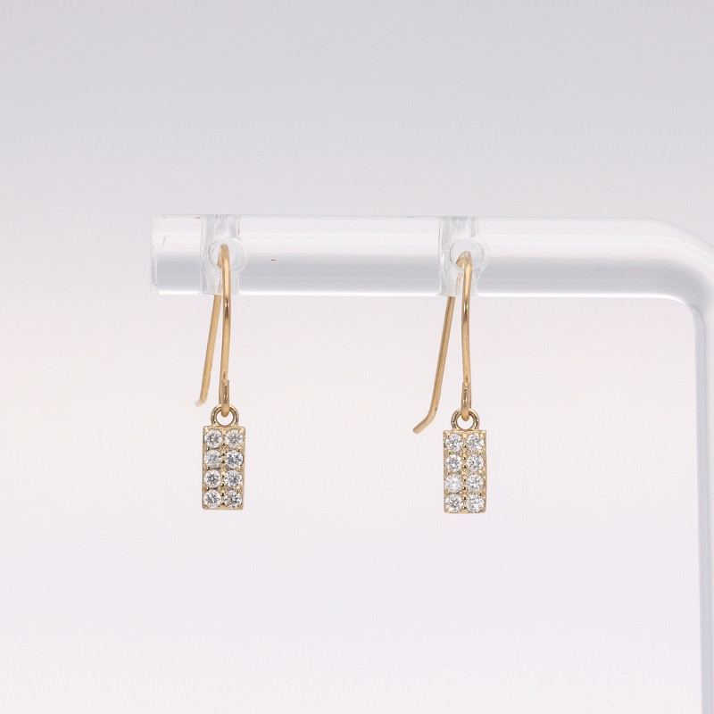 長方形のモチーフには、きらめくダイヤモンドが丁寧に敷き詰められ、洗練されたデザインが耳元を華やかに彩ります。軽やかなフックタイプで、日常使いから特別なシーンまで幅広く活躍。