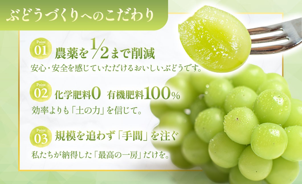 それだけでなく、化学肥料は使わず、有機肥料を使用し、手間暇を惜しまず丁寧なぶどう作りを行っております。