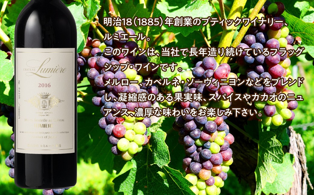 明治18(1885)年創業のブティックワイナリー、ルミエール。 このワインは、当社で長年造り続けているフラッグシップ・ワインです。 メルロー、カベルネ・ソーヴィニヨンなどをブレンドし、凝縮感のある果実味、スパイスやカカオのニュアンス、濃厚な味わいをお楽しみ下さい。 (写真はヴィンテージが異なります) ※6月~9月はクール便でお届けします。(通常便ご希望の方は連絡事項にその旨ご記入ください。) ※実際にお送りするワインはご注文時の最新ヴィンテージとなります。 ※20歳未満の者の飲酒は法律で禁止されています ? 株式会社ルミエール 0553-47-0207